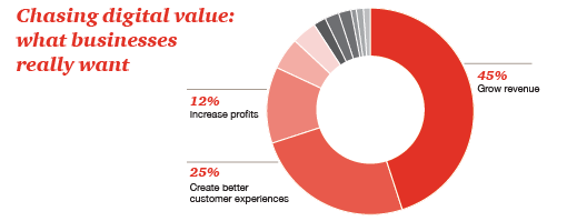 ישנה משמעות גדולה להגדיר מה הוא הערך שאנחנו משיגים מהדיגיטל– תוכלו לראות בגרף הבא את מגוון התשובות שקיבלו PWC מהסקר שערכו, חשוב להסתכל על ה-25 אחוז אשר מכוונים לכך שארגונים רוצים לייצר חווית לקוח טובה יותר באמצעות הדיגיטל, שכן בתפיסת העולם החדשה- הבסיס של חווית הלקוח באמצעות הInfrastructure של הדיגיטל יוביל לכך שנוכל להניב את שני האתגרים האחרים- הגדלת הרווח וצמיחה.