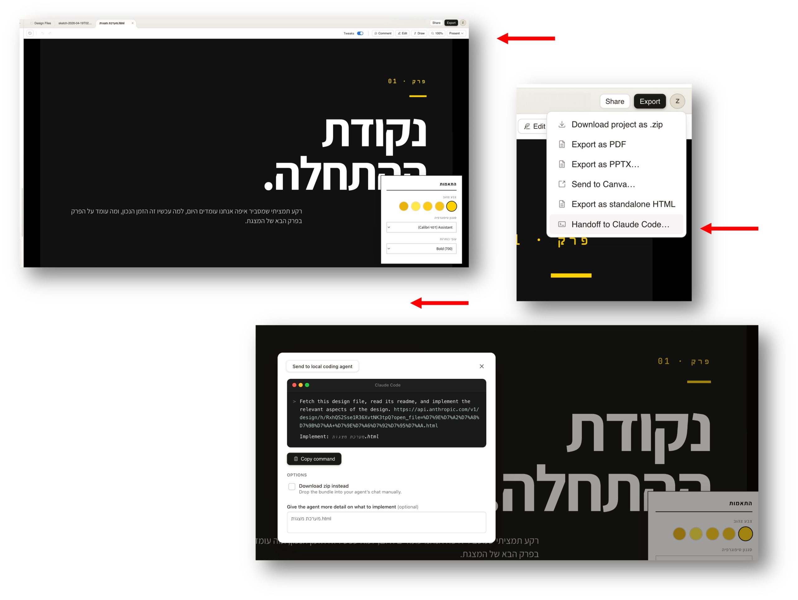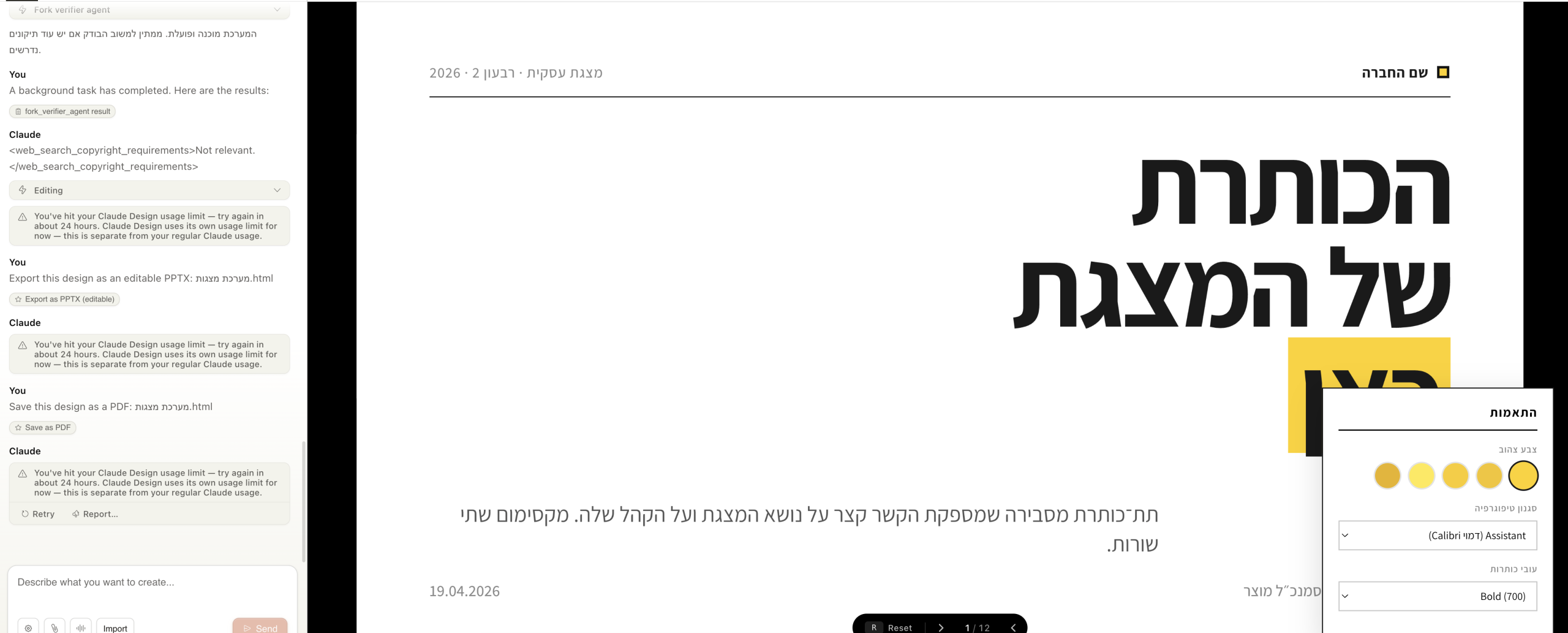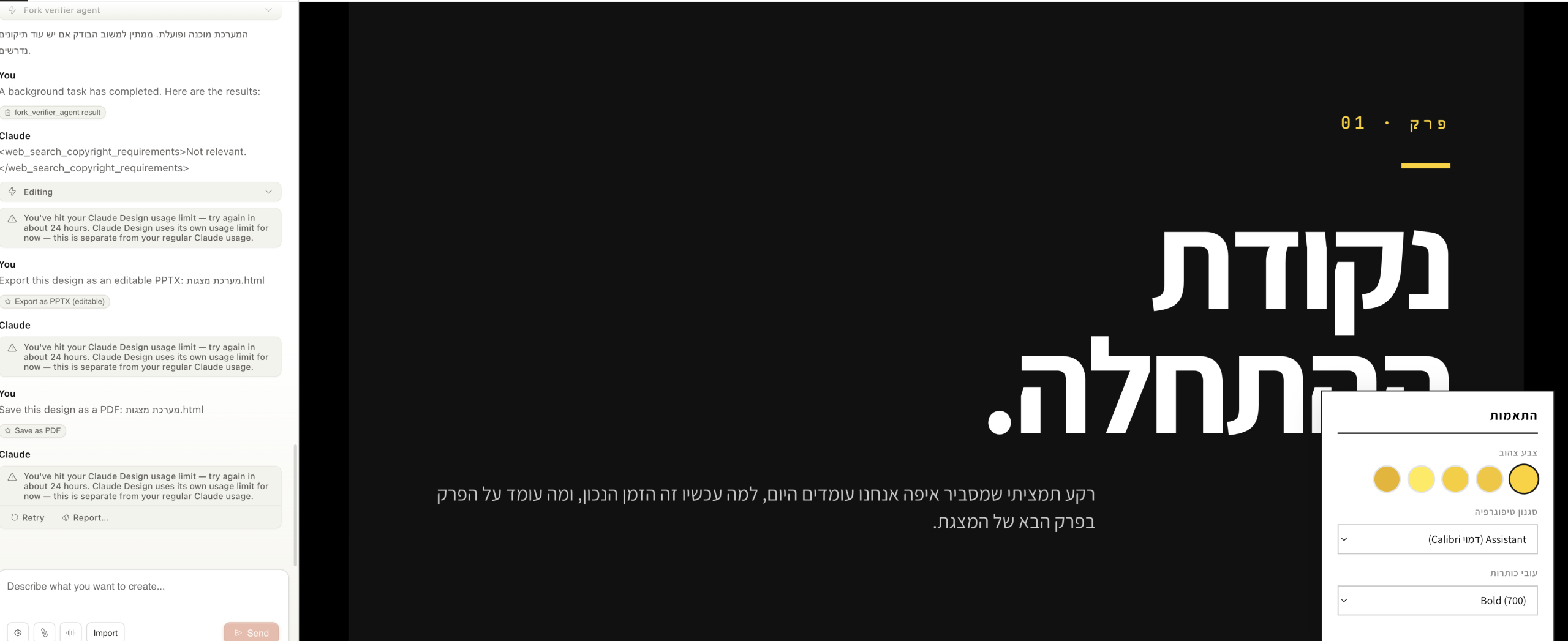כשהסיסטם נבנה לכם, תוכלו ליצור על בסיס מצגות ב”קלוד דיזיין”- אבל אני מזכירה לכם שמדובר במנוי נפרד. לכן, אם אתם רוצים להיות רגישים לקרדיטים בהם אתם משתמשים במערכת תוכלו ליצא את מה שבניתם לקלוד קוד ולהמשיך לבנות את המצגות על בסיס אותה חוקיות בדיוק בפלטפורמה זו. ניתן ליצא מכאן קבצים שיצרתם גם בפורמטים שונים כולל “פאוור פוינט”, וניתן לבקש מהמערכת ליצא לכם שקפים עם אפשרות של עריכה.
