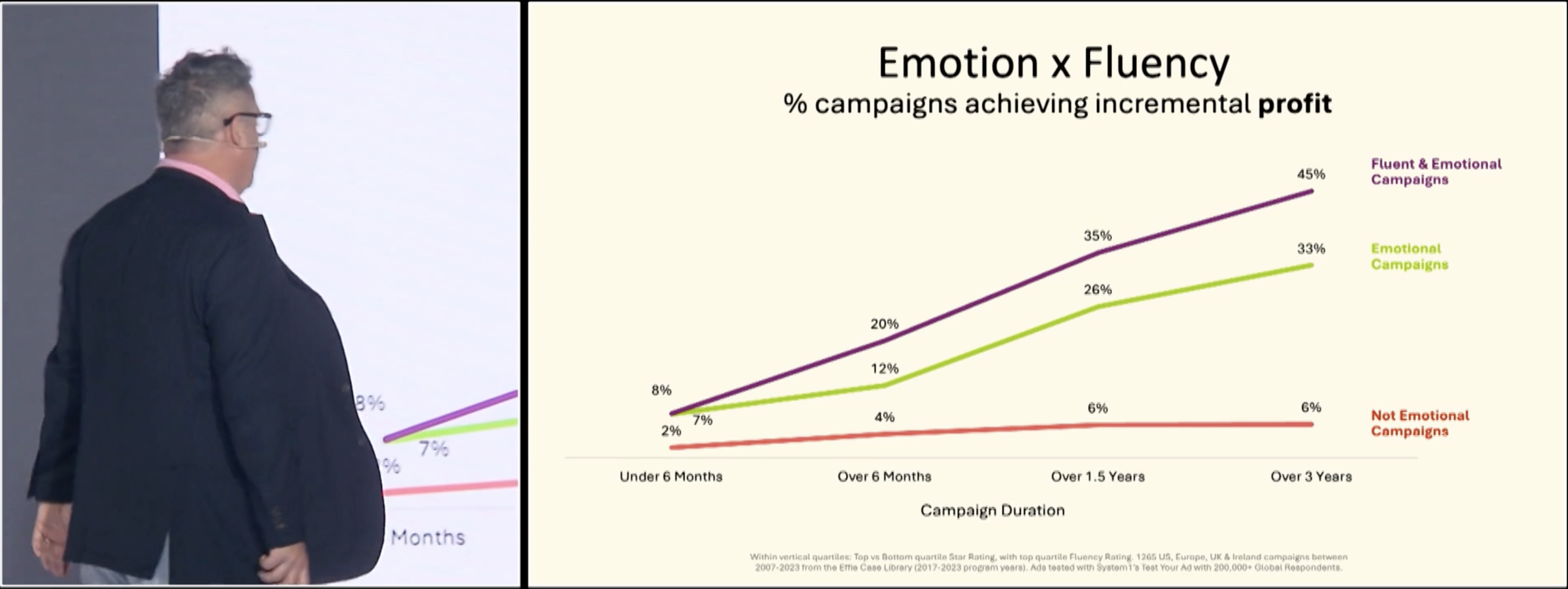 למה פרסומות ישנות טובות מחדשות? הנקודה הכי מפתיעה בהרצאה נוגעת לזמן. ריסטון מביא נתונים שמראים שמתוך יותר מ50,000 פרסומות שנבדקו, רק 14 באמת נשחקו. השאר עדיין עבדו טוב. פרסומות ישנות עובדות טוב מפרסומות חדשות. הוא משתמש בדוגמא של קיט קט שעובדת עם אותה סוכנות 90 שנה עם אותו מסר. וזה עובד כי זה פשוט, ברור, ועקבי. החברות שמשנות הכי מעט מקבלות את התוצאות הכי טובות.