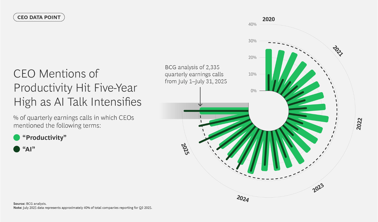 הנתון הכי בולט הוא שהיחס של בינה מלאכותית לפרודקטיביות הגיע לשיא של חמש שנים במהלך רבעון שלישי של השנה. כשמסתכלים על שיחות הרווחים של חברות, המילה Productivity הופיעה יותר מתמיד והיא הופיעה הקשר של בינה מלאכותית. זה מצביע על כך שמנכ”לים לא רק רואים בטכנולוגיה הזו כלי יעיל, אלא גם מאמינים שהיא יכולה לייצר שינוי אמיתי במדדי היעילות של החברות שלהם.